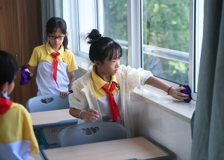 资料照片:2022年8月29日,浙江省湖州市吴兴区龙泉街道龙泉小学的学生在打扫教室,开启新学期“开学第一课”。新华社记者 徐昱 摄